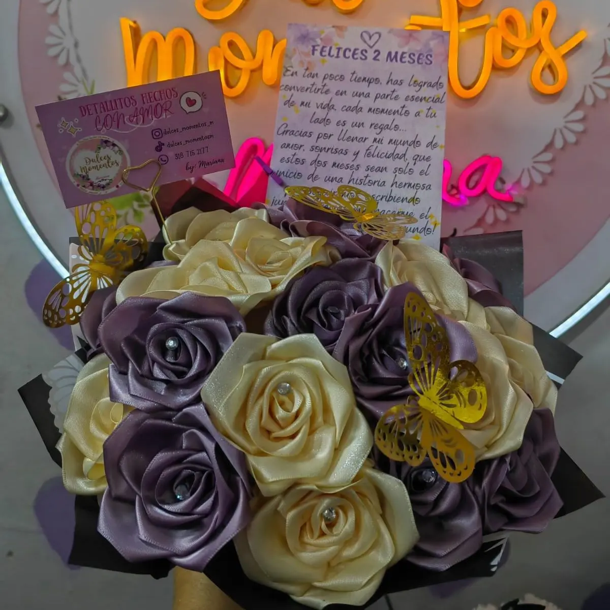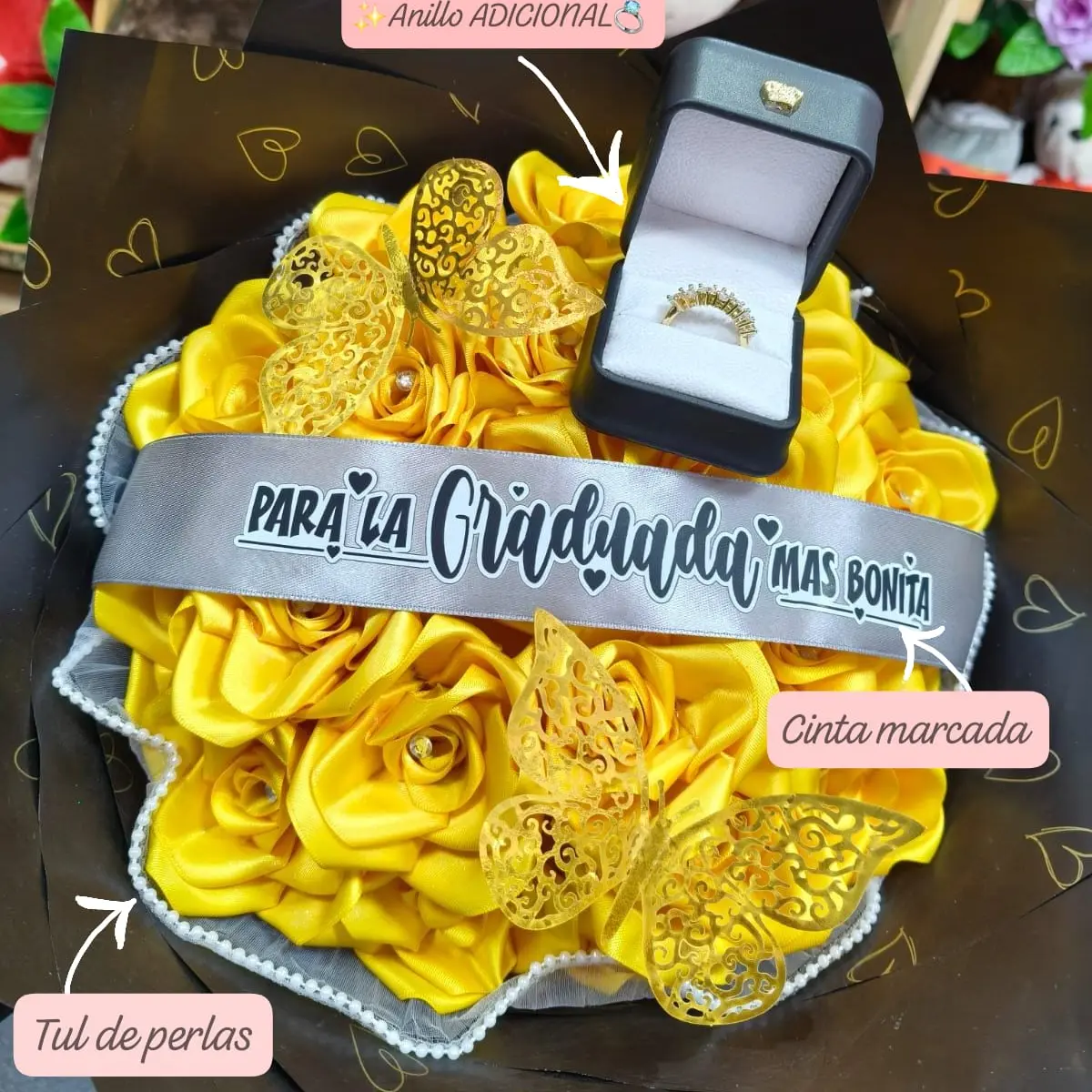 ✨️Puedes adicionar cinta marcada a tu ramito y/o tul con perlas, pregunta por la disponibilidad✨